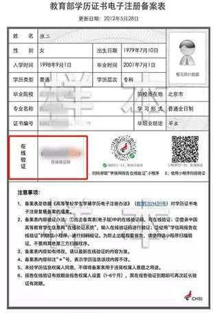 《教育部学历证书电子注册备案表》样图(仅学历校验有问题考生上传)