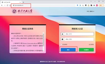 1.有线网络:访问外网时会默认弹出认证页面,在认证页面输入账号(学号或工号)和密码点击登录即可。若开机之后无法弹出新上网认证页面,在浏览器地址栏输入ip.ncut.edu.cn即可打开。