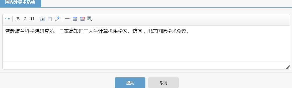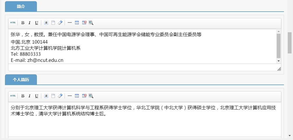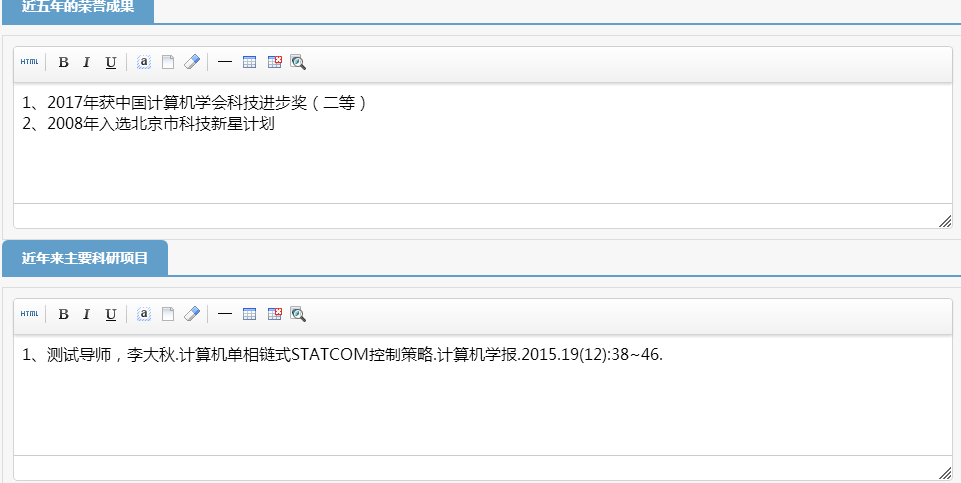 基本信息为研究生主页—导师队伍中显示内容,主要用于研究生招生宣传及师生互选。填写时字体和字号为默认,每填写一行要注意回车,并实时浏览,最后提交。每项内容填写格式可参照下图,希望导师结合实际情况实事求是填写。