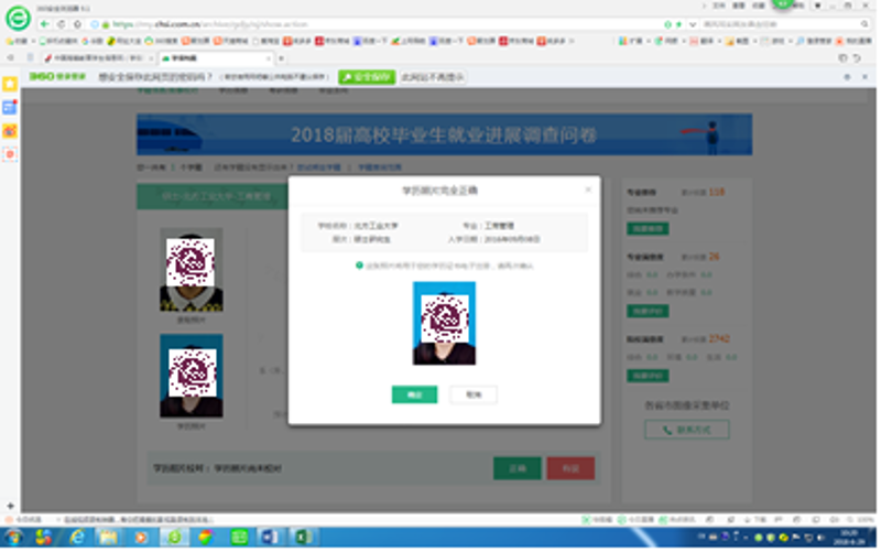 其次,进行学历照片校对,若学历照片正确,请点击”正确”按钮,进入学历照片界面,请点击“确认”按钮。若判断失误,可以更改校对结论,重新进行学历照片校对。