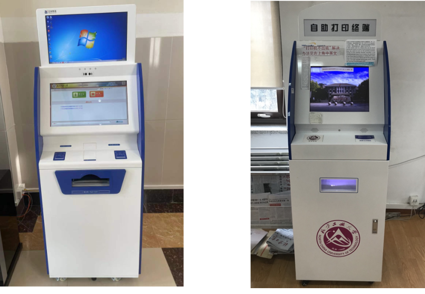 上方左图为新机外观,新机试运行时屏幕上以“研究生”字样进行标识,以区别本科生自助打印终端;上方右图为旧机外观,与其它自助终端有显著差别。