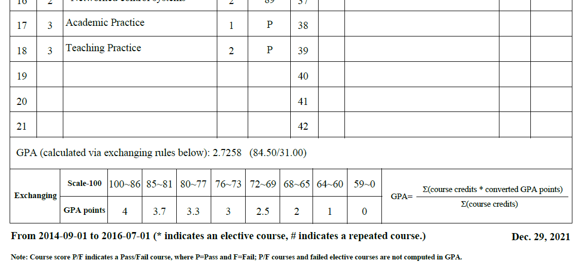 根据各年级研究生培养方案及学校教务系统运行机制,研究生课程成绩单按课程编码(课程唯一标识)列出各课程成绩,若存在多条同一课程编码的记录,成绩单中仅列出该课程的最高成绩记录;升级后的成绩单提供平均加权学分绩点(Grade-Point Average, GPA),计算规则如下:
