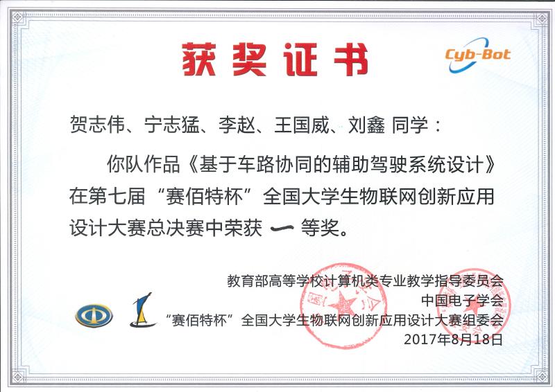 2017年8月17日-8月18日,由教育部高等学校计算机类专业教学指导委员会、中国电子学会为主办单位,中国电子学会物联网专家委员会、北京赛佰特科技有限公司为承办单位的第七届“赛佰特杯”全国大学生物联网创新应用设计大赛总决赛在北京成功举办。我校电气与控制工程学院《基于车路协同德辅助驾驶系统设计》项目(成员:贺志伟、宁志猛、李赵、王国威、刘鑫,指导老师:张永忠)获全国一等奖。